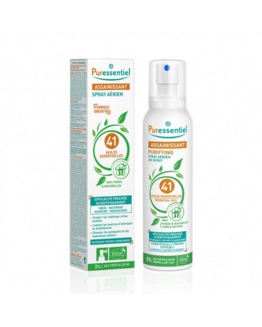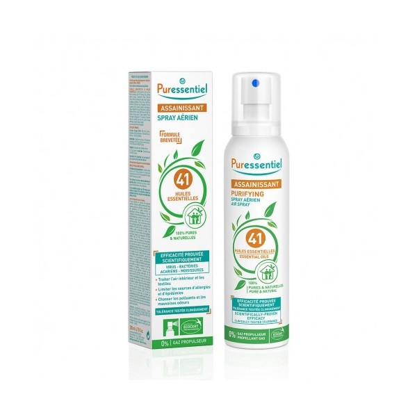 Le Spray Assainissant Puressentiel est une formule brevetée de 41 huiles essentielles 100% pures et naturelles. Efficacité prouvée : Elimine plus de 99,9% des bactéries et virus.